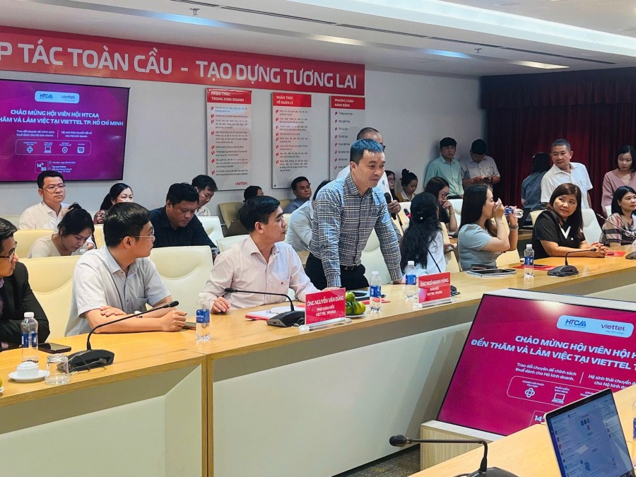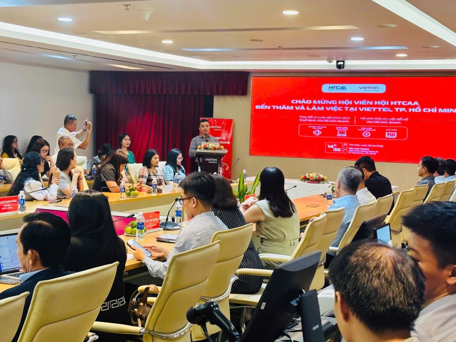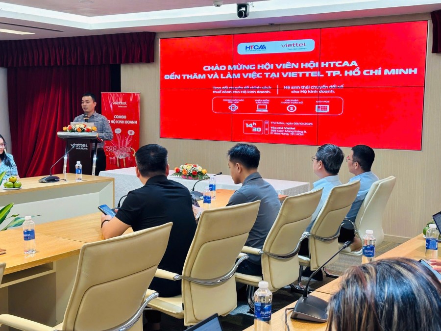 Tại buổi làm việc, Bà Lê Thị Thu Hương – Chủ tịch HTCAA bày tỏ mong muốn tăng cường hợp tác giữa Hội và Viettel TP.HCM, đặc biệt trong giai đoạn ngành Thuế đang triển khai chủ trương chuyển đổi Hộ kinh doanh từ thuế khoán sang thuế kê khai theo định hướng của Bộ Chính trị và Cục Thuế TP.HCM. Theo Thỏa thuận hợp tác số 0109/Thuế TP.HCM-Viettel TP.HCM/2025 ký kết vào ngày 26/9/2025, Viettel TP.HCM được giao phối hợp tuyên truyền, tập huấn và hỗ trợ hơn 200.000 Hộ kinh doanh trên toàn Thành phố trong công tác chuyển đổi sang kê khai thuế.