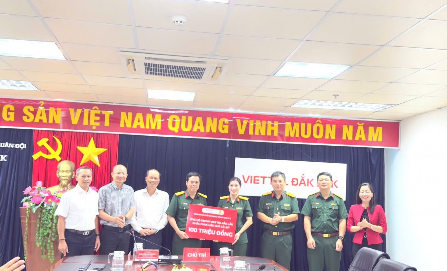 Đoàn công tác đã trực tiếp trao tặng Viettel Đắk Lắk số tiền 100 triệu đồng để kịp thời hỗ trợ và động viên đơn vị và các gia đình CBCNV tiêp tục khắc phục khó khăn cơn bão số 13 gây ra và phấn đấu hoàn thành xuất sắc nhiệm vụ giao.