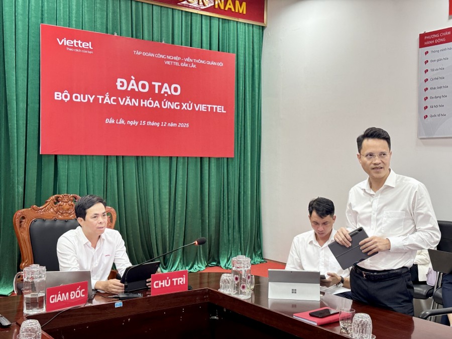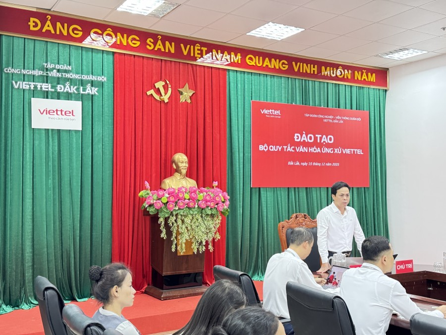 Thực hiện tiêu chuẩn văn hóa Viettel, sáng ngày 15/12/2025, Viettel Đắk Lắk tổ chức buổi đào tạo Bộ Quy tắc Văn hoá Ứng xử Viettel, với sự trực tiếp chia sẻ và dẫn dắt của đồng chí Phạm Việt Hùng - Giám đốc Chi nhánh cùng sự tham gia đóng góp, thảo luận các đồng chí trong BGĐ Chi nhánh, tham gia dự buổi đào tạo có CBCNV khối văn phòng và 24 điểm cầu truyền hình Viettel Cụm với toàn thể hơn 180 đồng chí.