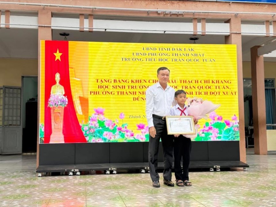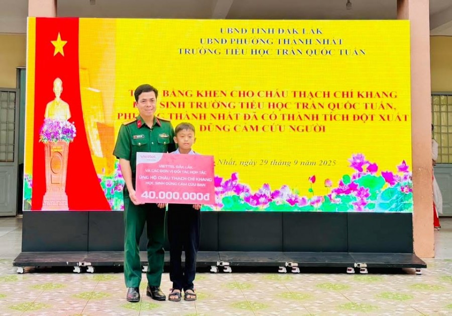 Viettel Đắk Lắk đã trao tặng phần quà trị giá 40 triệu đồng cho em 𝐓𝐡𝐚̣𝐜𝐡 𝐂𝐡𝐢́ 𝐊𝐡𝐚𝐧𝐠 (học sinh lớp 5A3, Trường Tiểu học Trần Quốc Tuấn) - có hành động dũng cảm cứu bạn trong vụ trọng án nghiêm trọng sát hại 3 người trong một gia đình xảy ra ngày 13/9/2025 tại phường Thành Nhất.