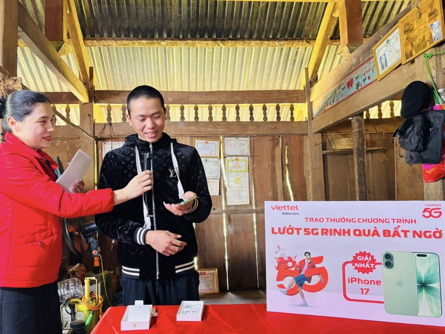 Ngày 26/11/2025, đồng chí Trung tá Nguyễn Ngọc Nguyên – Giám đốc Viettel Lai Châu đã trực tiếp đến tận địa phương để trao chiếc iPhone 17 đầu tiên trong chương trình “Lướt 5G – Rinh quà bất ngờ” cho khách hàng may mắn Lò Văn Đỉa, địa chỉ tại Bản Nậm Cóong, Xã Nậm Cuổi, Tỉnh Lai Châu. Đây không chỉ là một món quà giá trị, mà còn là lời khẳng định về sự minh bạch và trách nhiệm mà Viettel luôn gìn giữ trong từng chương trình tri ân.