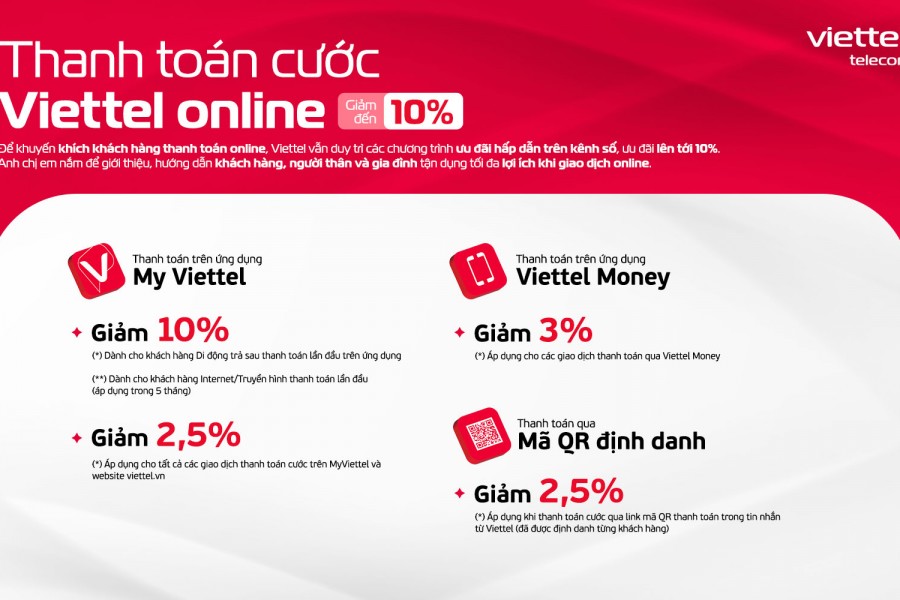 Chiết khấu lên đến 10% khi thanh toán cước Viettel trên kênh số