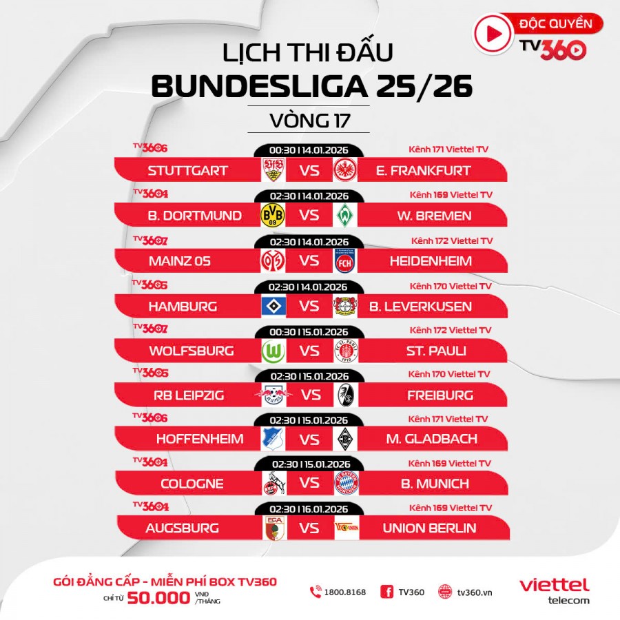 Ở đấu trường châu Âu, Bundesliga tiếp tục là một trong những nội dung trọng điểm của TV360. Các vòng đấu 17–18 diễn ra liên tiếp, đánh dấu giai đoạn quan trọng trong cuộc đua vô địch, nhóm dự cúp châu Âu cũng như cuộc chiến trụ hạng.