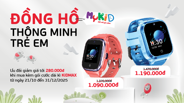 Viettel Telecom ưu đãi giảm giá đến 280.000 đồng cho khách hàng mua đồng hồ thông minh MyKID kèm gói cước dài kỳ KIDMAX, áp dụng đến hết ngày 31/12/2025.