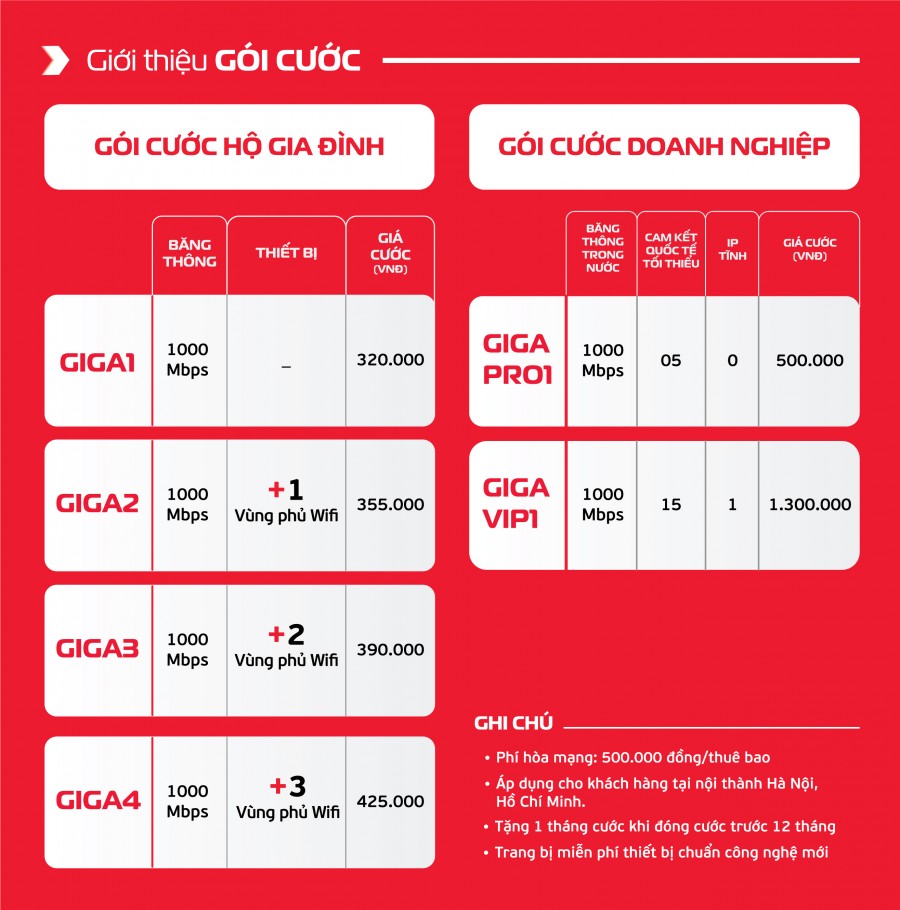 Dưới đây là bảng giá gói cước Internet Viettel GIGA: