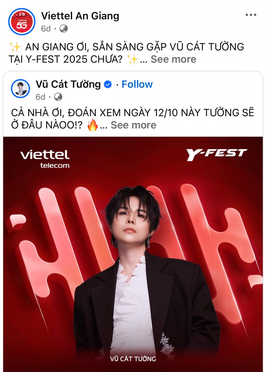 Viettel Y-Fest tại An Giang hứa hẹn sẽ là một đêm không thể bỏ qua, nơi kết nối cảm xúc, bùng nổ năng lượng và khẳng định tinh thần trẻ trung, năng động tại miền Tây sông nước.